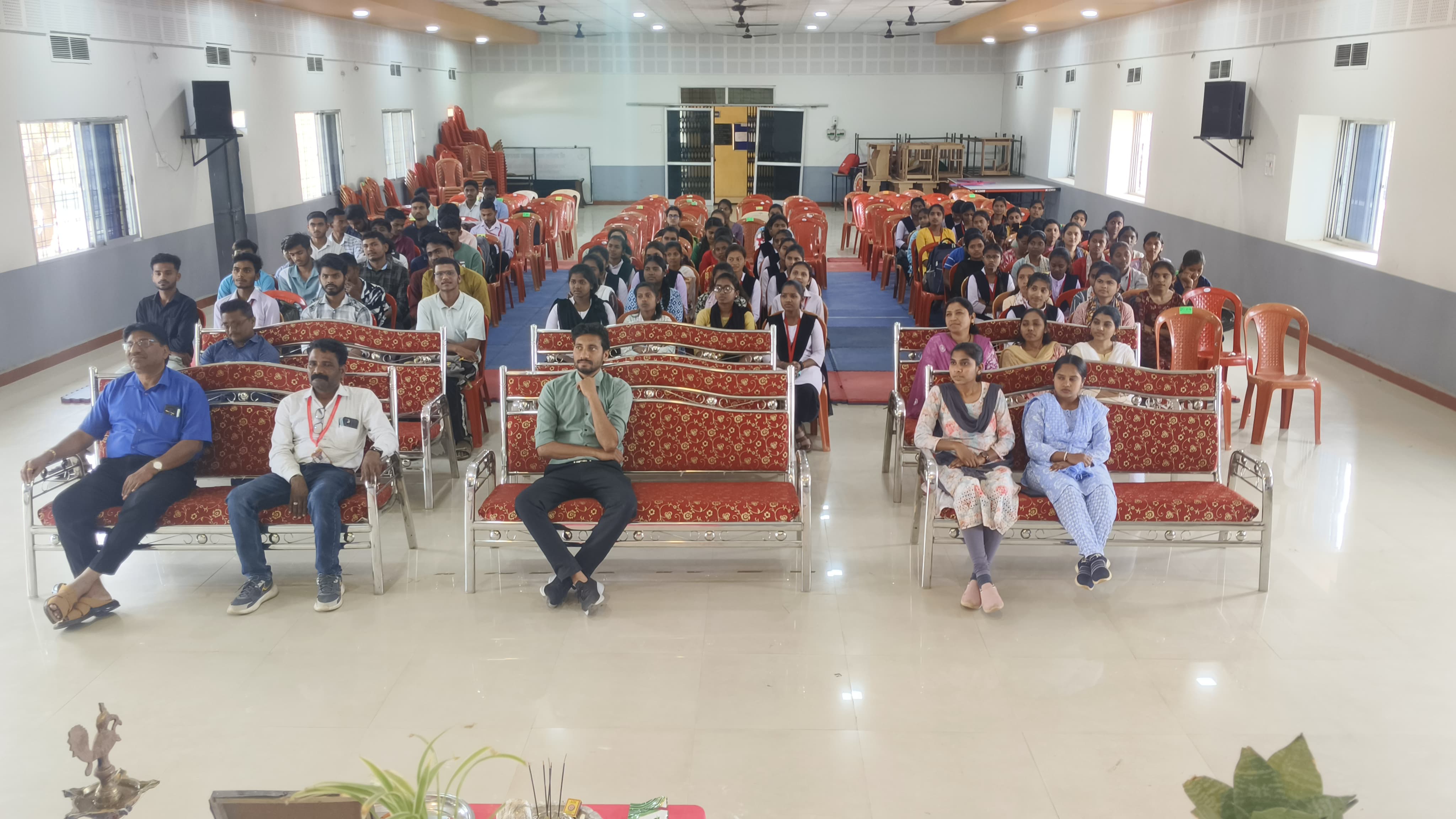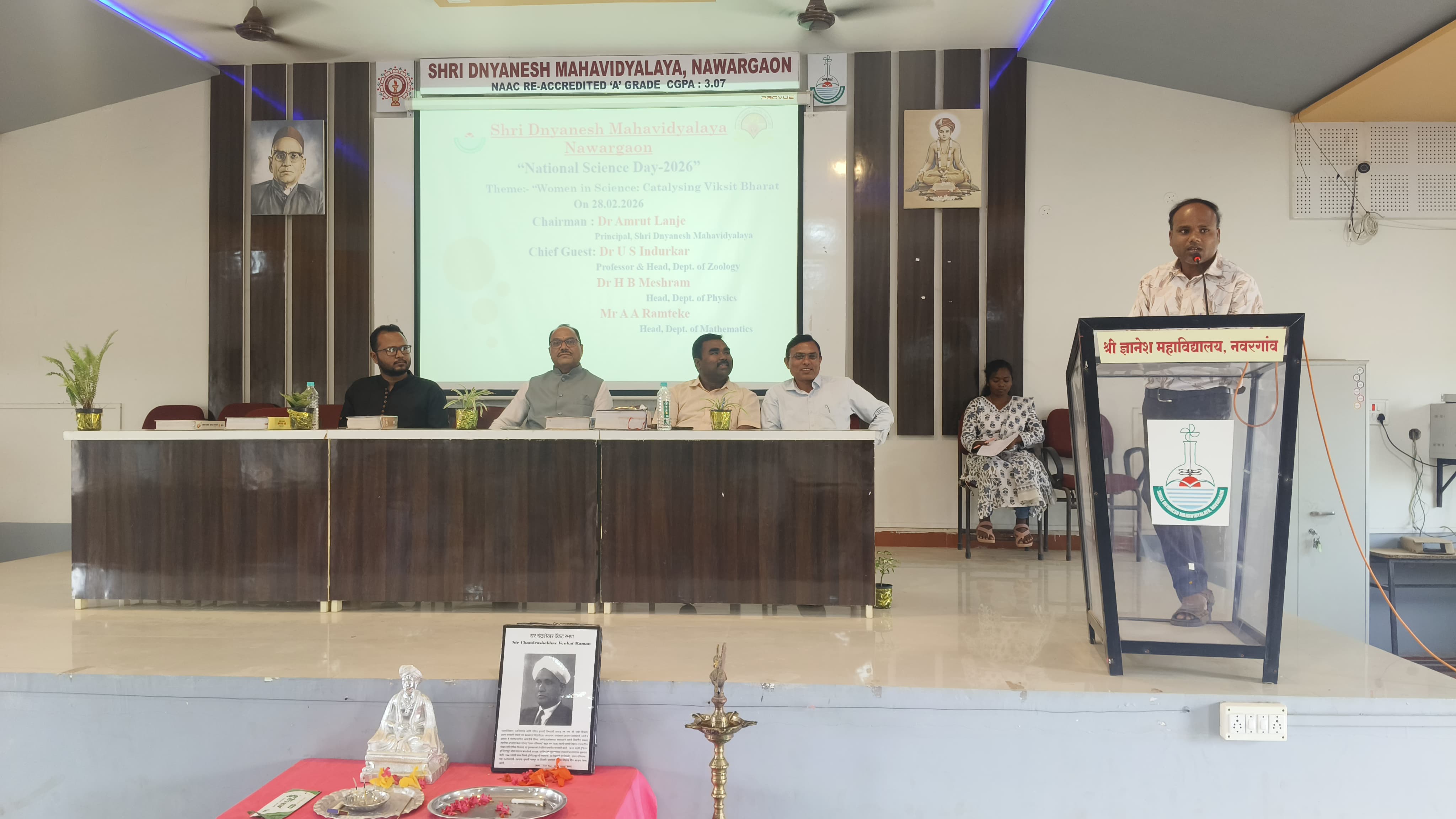 The program began with the guests offering flowers to the portrait of Dr. C. V. Raman and lighting a lamp.