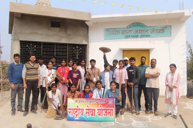 The fourth day of the NSS camp is Thursday, January 22, 2026. As usual, Prof. Durgesh Kshirsagar started the yoga practice and exercise by waking up at 5 am, followed by prayers and singing inspirational songs from 6 to 7.30 am. After the exercise, all the volunteers had snacks and tea. Between 2.30 to 4.30 pm, Prof. Ram Raut, Farmer Principal Janata Kanistha Mahavidyalaya, Neri gave detailed guidance on the topic of “Ajachya Kalatil Yuvak va Rashtasantanche Tatvadyan” in the intellectual programs. This program was presided over by Prof. Gyanidas Gahane, of Shri Dnyanesh Mahavidyalaya Nawargaon. After the intellectual program, all the volunteers went to Nadgaon village for a survey. Group discussions and questions and answers were conducted based on that survey. From 6 to 7.30 pm, a review meeting of the day’s program was held by assembling the volunteers. After the meeting, the new group leader and the new OD were elected democratically. Later, everyone enjoyed the food. At 9 pm, Gondi dance, drama, and singing were presented by NSS volunteers in the cultural programs. The day ended with prayers and lamp immersion.
