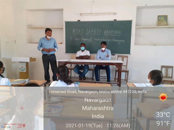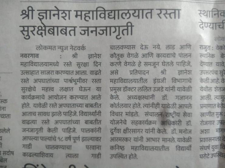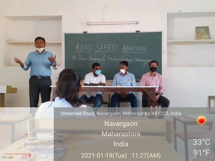 Shri Dnyanesh Mahavidyalaya, Nawargaon organized an awareness programme under Road Safety Campaign on 19th Jan 2020. 41 Students including teachers were present over there. Dr Ujede, Head, Dept of English spoke on the importance of following the rules and regulations regarding traffic whereas Dr Kortalwar, Head, Dept of Marathi addressed the gathering focussing on road safety. The program was compered by Mr Kshirsagar whereas a vote of thanks was proposed by Dr Armarkar, NSS Programme Officer.
