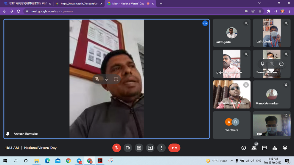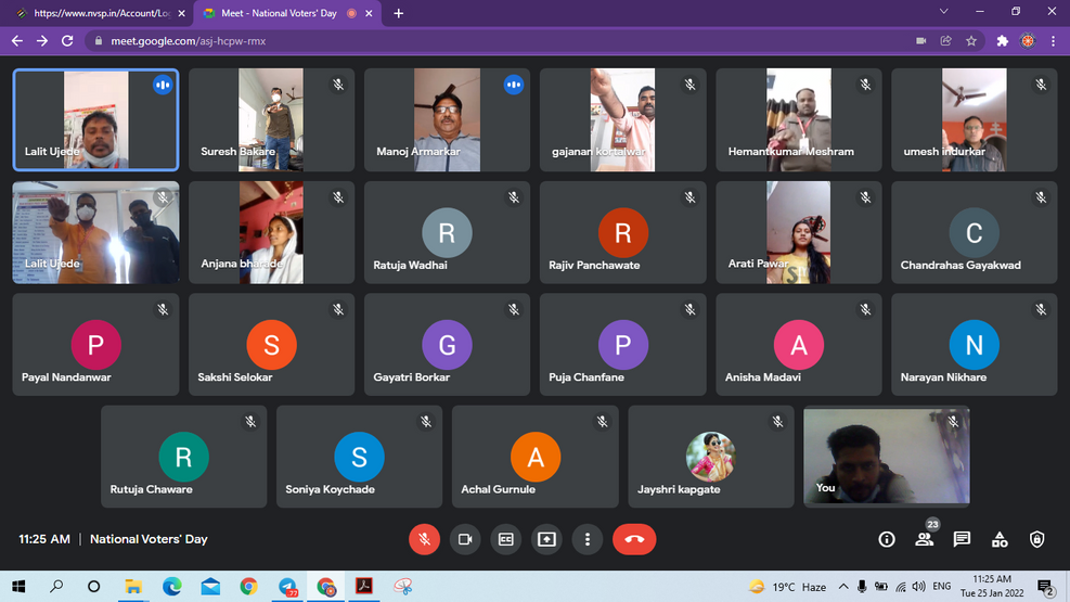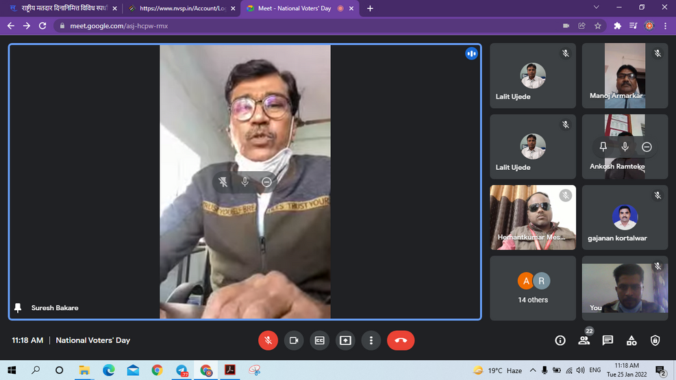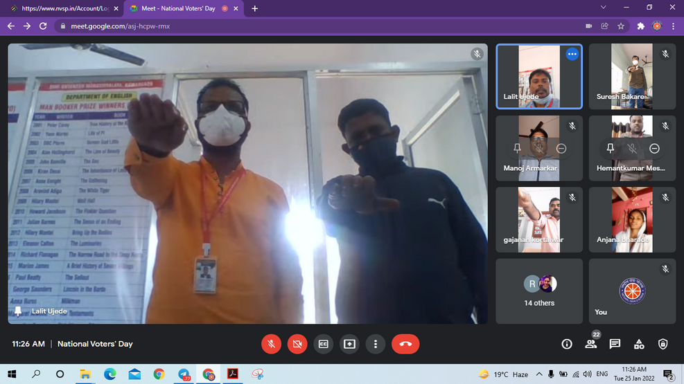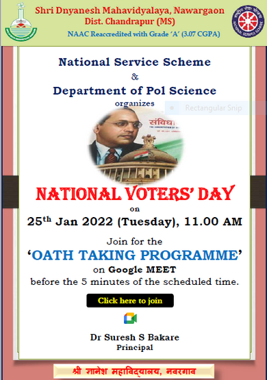 जगातील सर्वात मोठे लोकशाही राष्ट्र म्हणून ओळख असलेल्या भारत देशात लोकशाहीचे प्रथम कर्तव्य म्हणून मतदान करणाऱ्यांची संख्या कमी होणे ही चिंतनीय बाब आहे. यादृष्टीने राष्ट्रीय स्तरावर विविध प्रयत्न करण्यात येत आहेत. या प्रयत्नांचा एक भाग म्हणून दर वर्षी “राष्ट्रीय मतदाता दिन” 25 जानेवारी या दिवशी साजरा करण्यात येतो. आज राष्ट्रीय मतदाता दिनाच्या निमित्ताने राष्ट्रीय सेवा योजना पथक तथा राज्यशास्त्र विभाग यांच्या विद्यमाने महाविद्यालयात आभासी पद्धतीने *राष्ट्रीय मतदाता दिन* साजरा करण्यात आला. या कार्यक्रमाच्या अध्यक्षस्थानी महाविद्यालयाचे प्राचार्य डॉ बाकरे सर उपस्थित होते व त्यांनी उपस्थितांना मार्गदर्शनही केले. कार्यक्रमाचे प्रास्ताविक व संचालन राज्यशास्त्र विभाग प्रमुख प्रा विष्णू बोरकर यांनी केले. प्रा उजेडे यांनी मतदारांसाठी प्रतिज्ञा याचे वाचन करून सर्वांना सामूहिक प्रतिज्ञा दिली. रासेयो सहकार्यक्रम अधिकारी प्रा क्षीरसागर यांनी आभार प्रदर्शन केले. या कार्यक्रमाच्या यशस्वितेसाठी रासेयो कार्यक्रम अधिकारी डॉ अरमरकर यांनी प्रयत्न केले. या आभासी कार्यक्रमात अनेक प्राध्यापकगण तथा विद्यार्थी यांनी सहभाग नोंदविला.